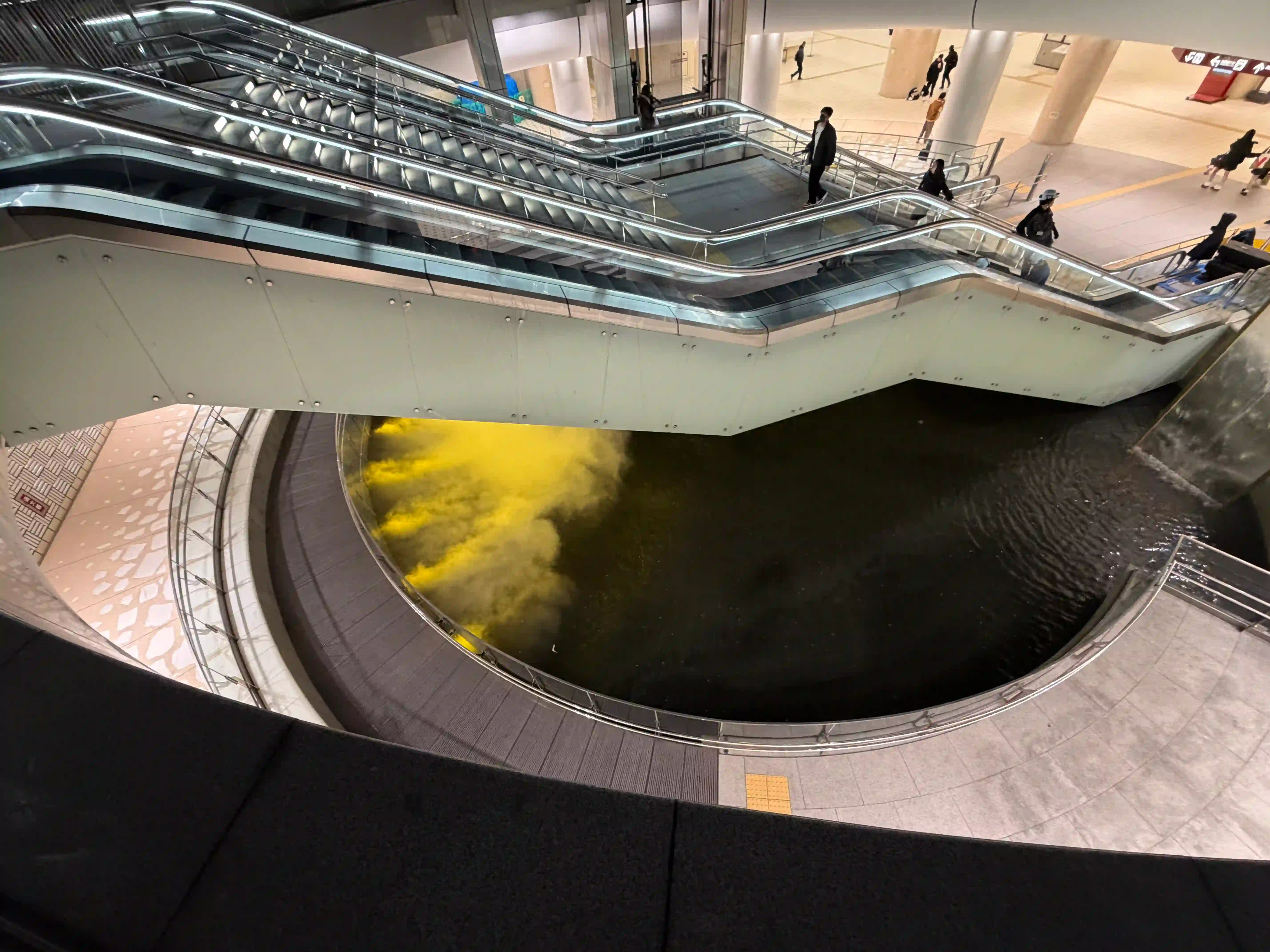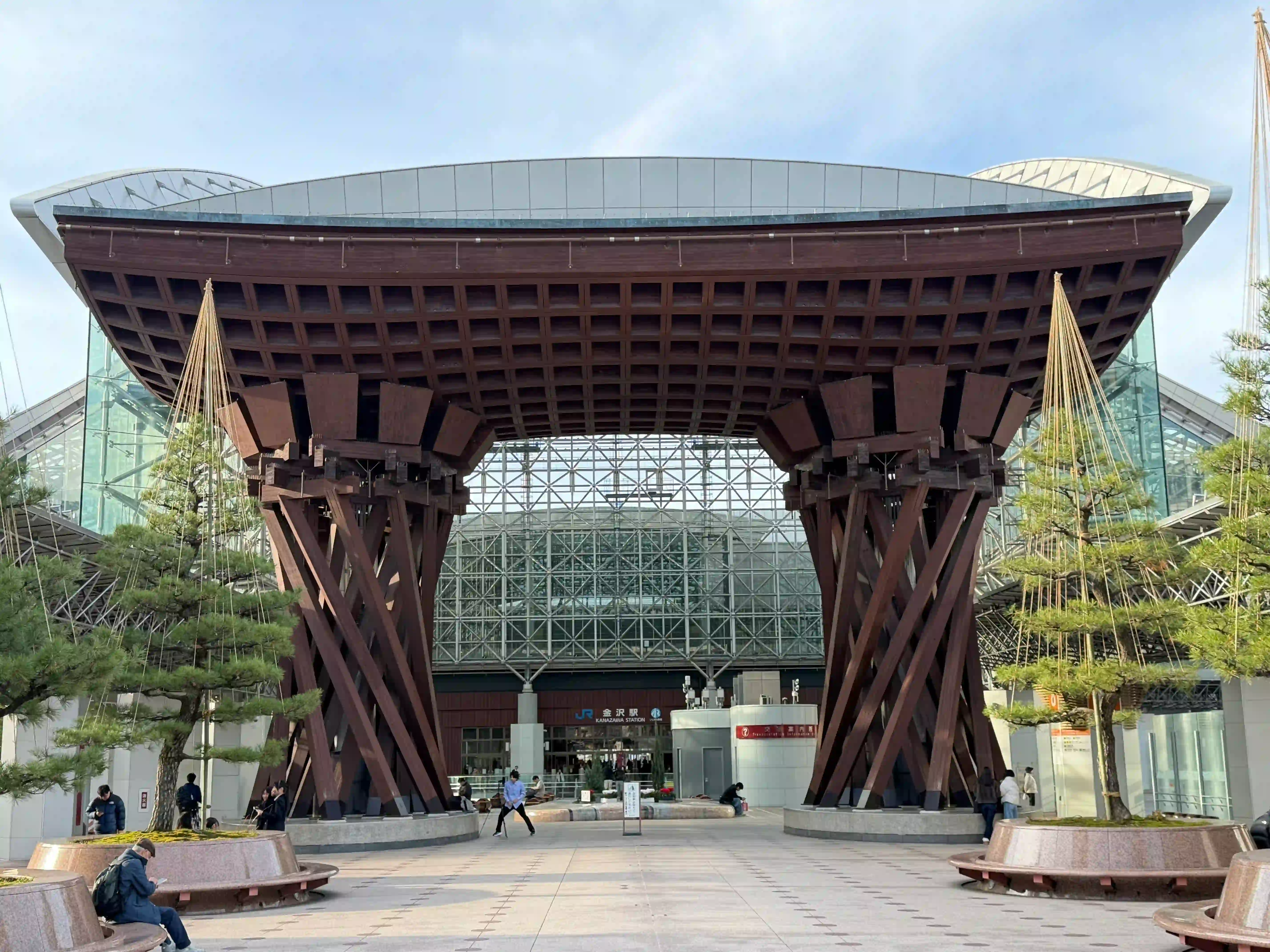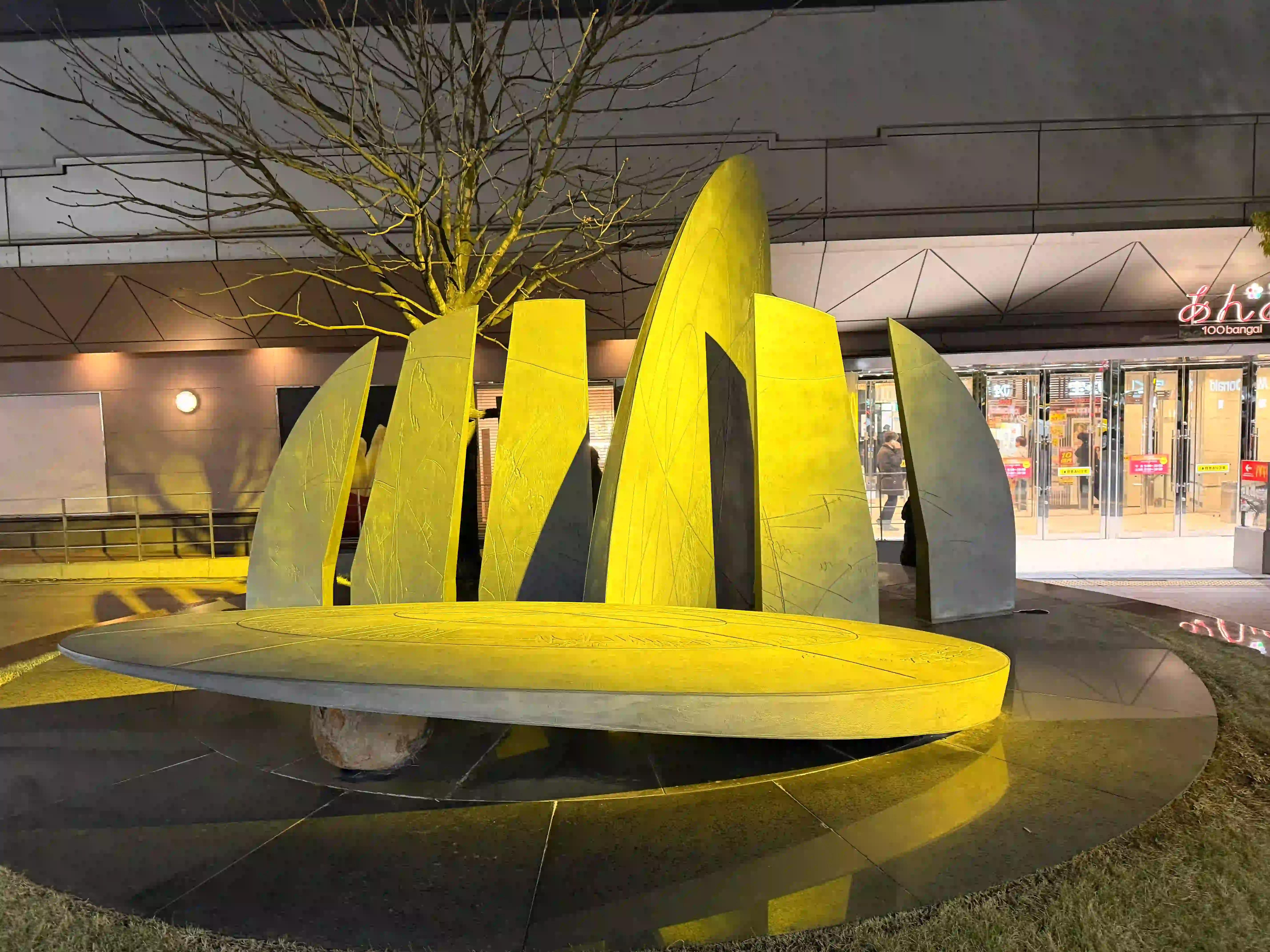 金泽车站雕塑与人工池塘在金色投光灯照耀下熠熠生辉(金泽市政府)